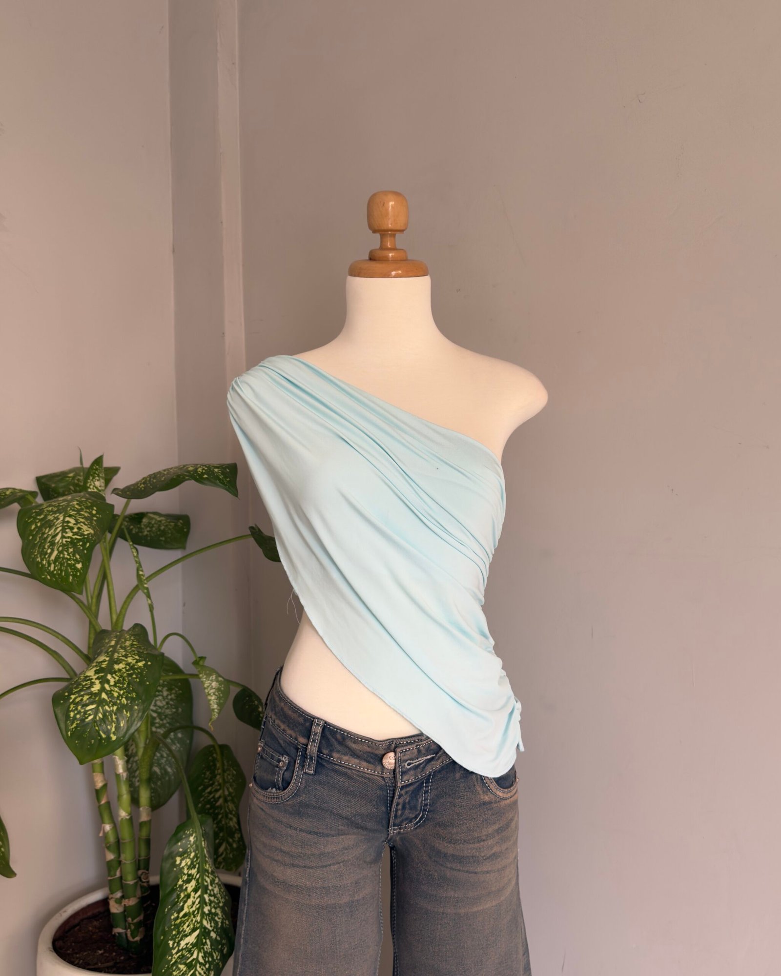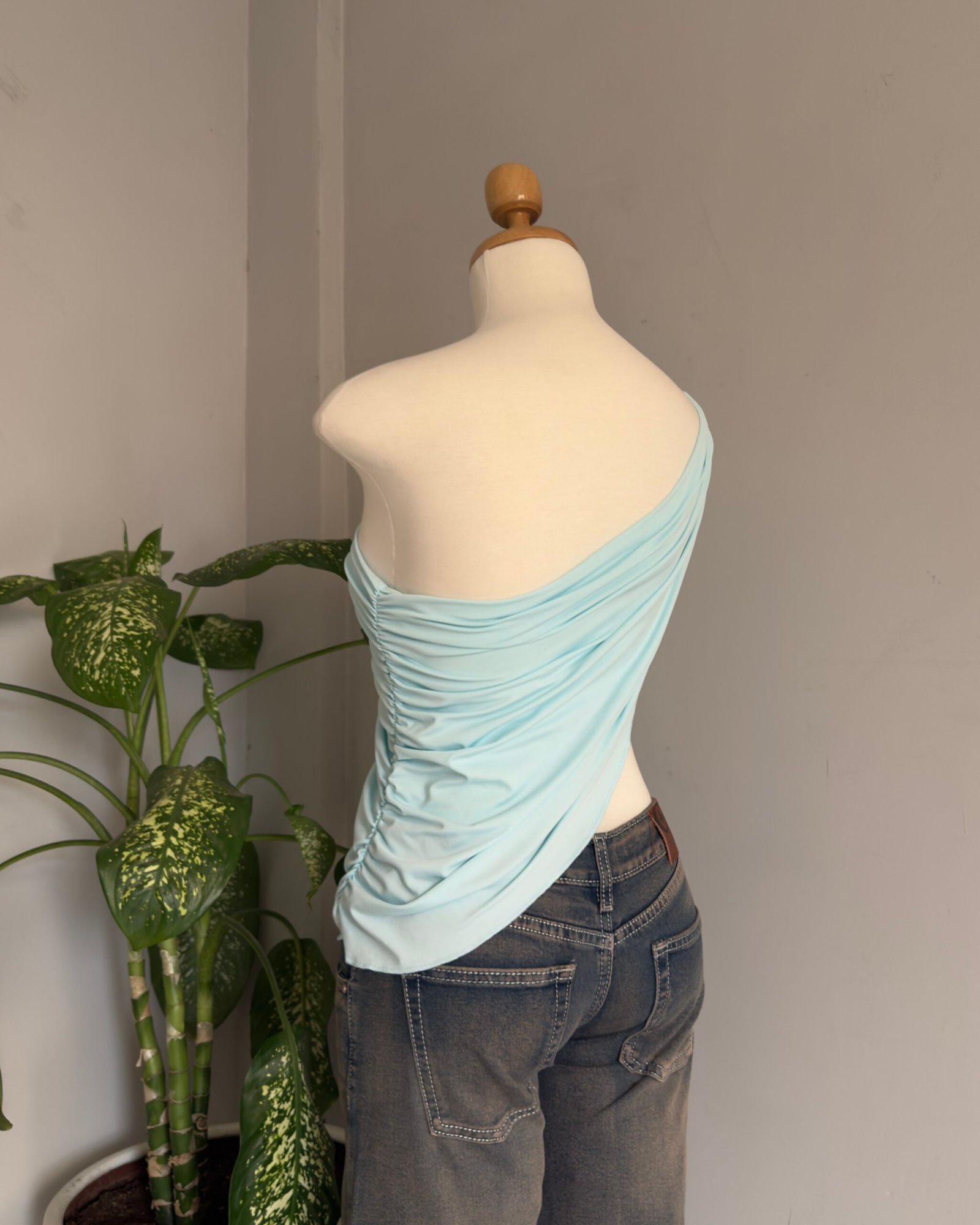 Top asimétrico con doble forro, elaborado en material suplex. Talla estándar. ✨👗